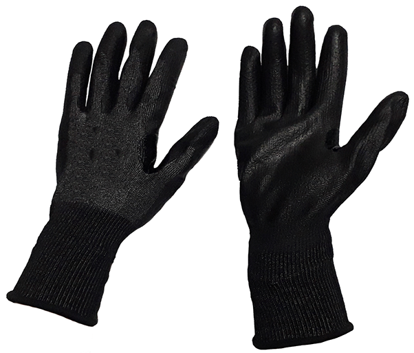 Guanto antitaglio spalmato in poliuretano nero con rinforzo tra pollice e indice.