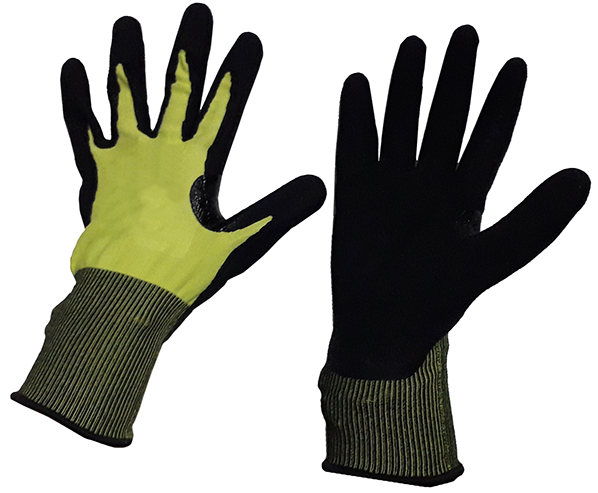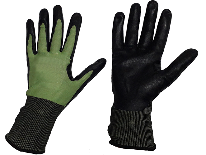 Guanto antitaglio verde spalmato in lattice microfoam nero con rinforzo tra pollice e indice.