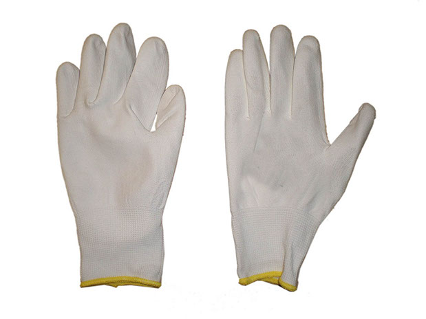 Guanto in poliestere bianco, spalmato su palmo e dita con poliuretano bianco.