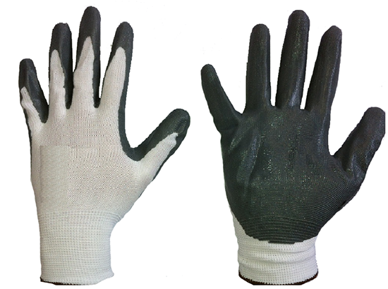 Guanto in poliestere bianco, spalmato su palmo e dita con nitrile grigio.