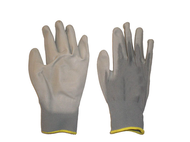 Guanto in poliestere grigio, spalmato su palmo e dita con poliuretano grigio.