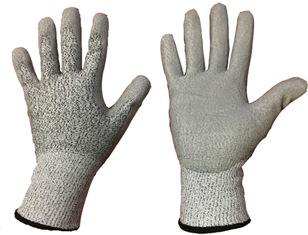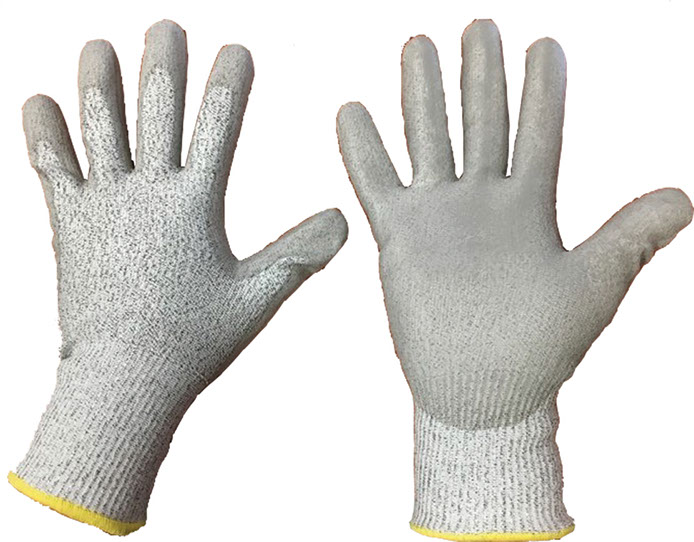Guanto a filo continuo in HPPE, nylon e spandex con spalmatura in poliuretano su palmo e dita, dorso e polsino elastico traspirante. Resistenza al taglio 5.