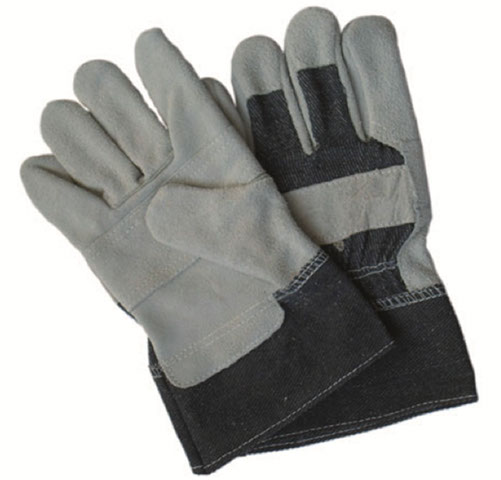 Guanto in crosta con dorso in jeans, palmo rinforzato, manichetta in tela da 7 cm.