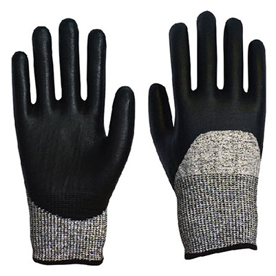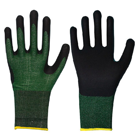 Guanto in filato antitaglio 18G Livello D, E palmo rivestito in foam nitrile, rinforzo tra pollice ed indice
